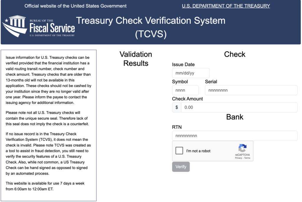 The most basic way to verify a Treasury check is through the Treasury’s public-facing TCVS website. This free tool allows financial institutions to manually enter check details—such as the check symbol, serial number, date, valid routing transit number, and payment amount—to confirm authenticity.
