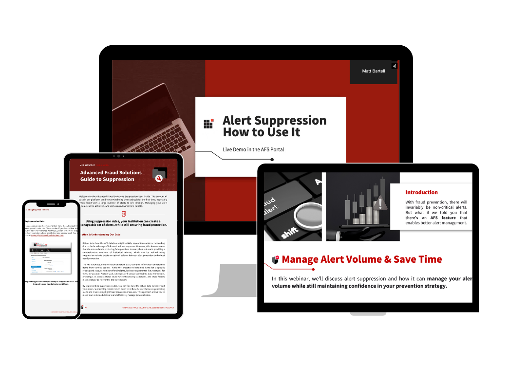 Discover the power of alert suppression in this webinar. This focused, 15 minute session dives into how to leverage alert suppression to streamline operations, enhance critical fraud detection, and reduce distractions. Don’t miss the opportunity to transform your data management approach and reduce operational overwhelm.